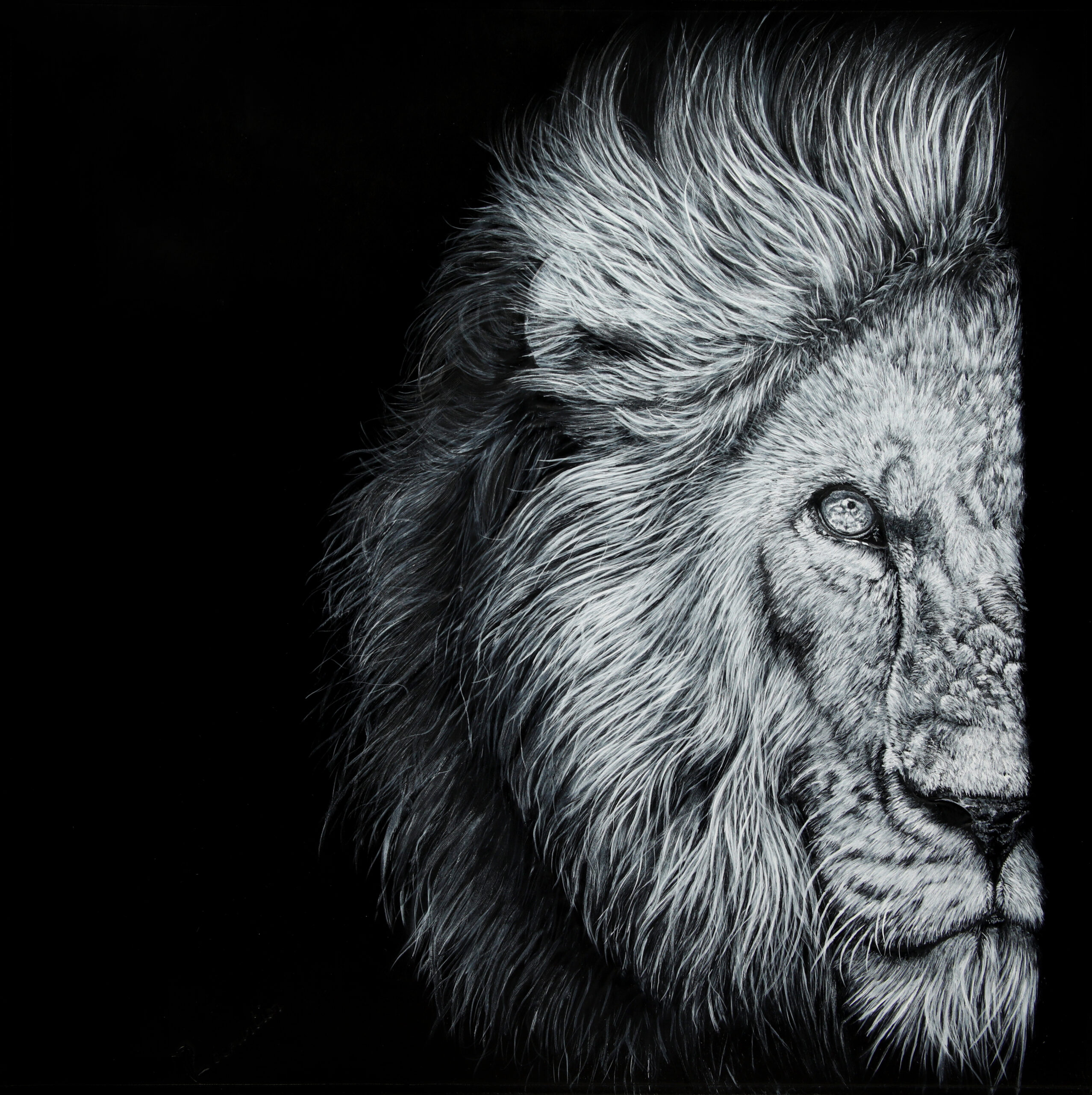Empreinte sauvage de ce Lion Sculpté et peint sur cuir noir.